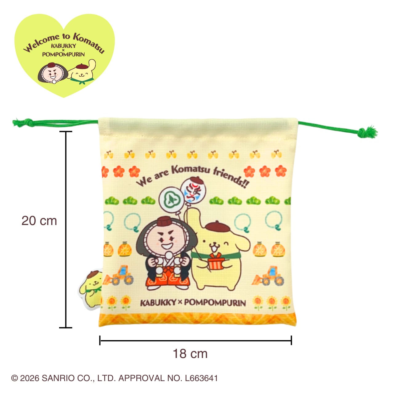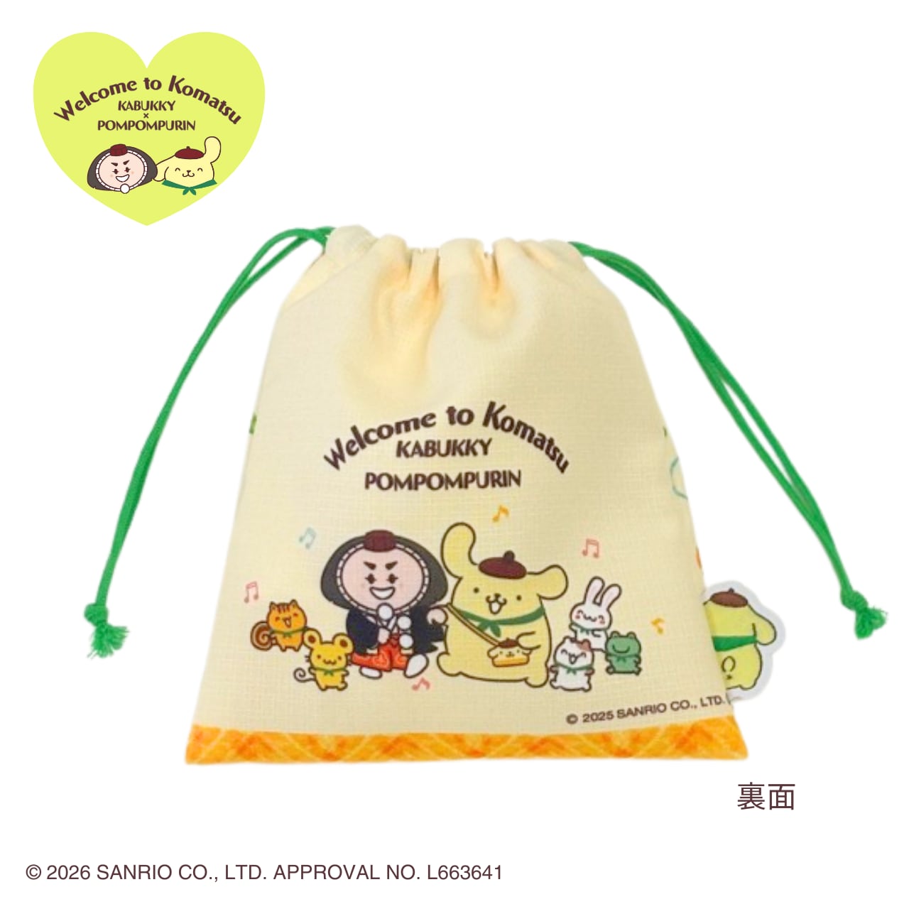 石川県小松市の公式キャラクター「カブッキー」と、「ポムポムプリン」が描かれた、かわいさと実用性を兼ねたアイテム、巾着です。