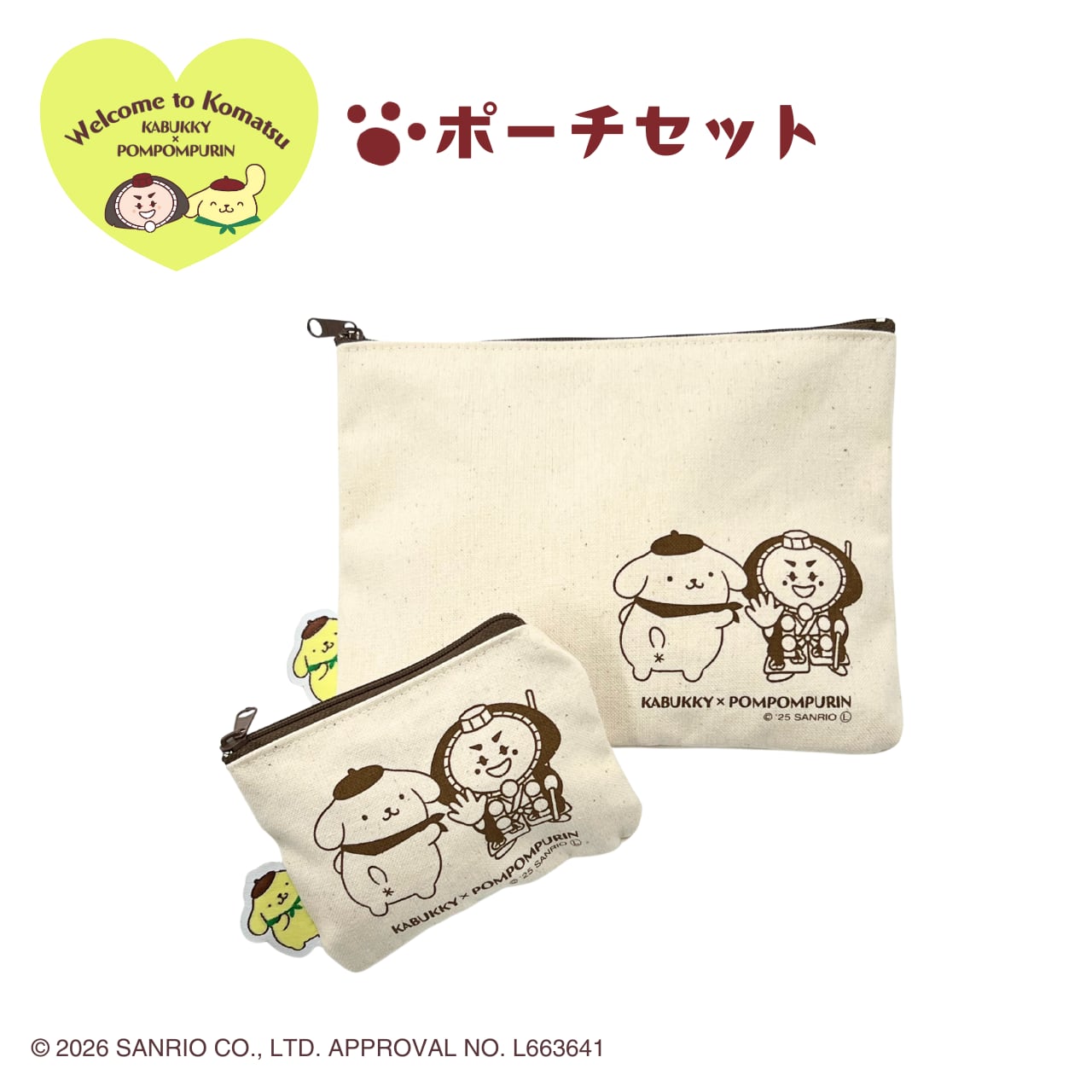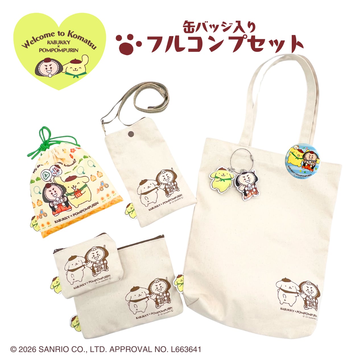 石川県小松市の公式キャラクター「カブッキー」と、「ポムポムプリン」が描かれた、かわいさと実用性を兼ねたグッズのフルコンプリートセットです。