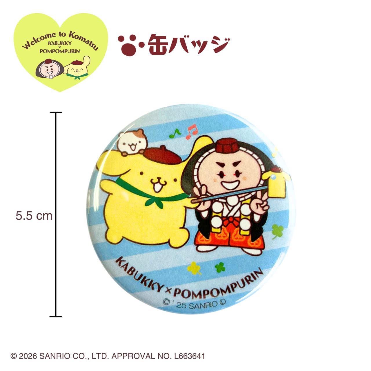 石川県小松市の公式キャラクター「カブッキー」と、「ポムポムプリン」が描かれた、缶バッジです。水色のストライプ柄がさわやかです。