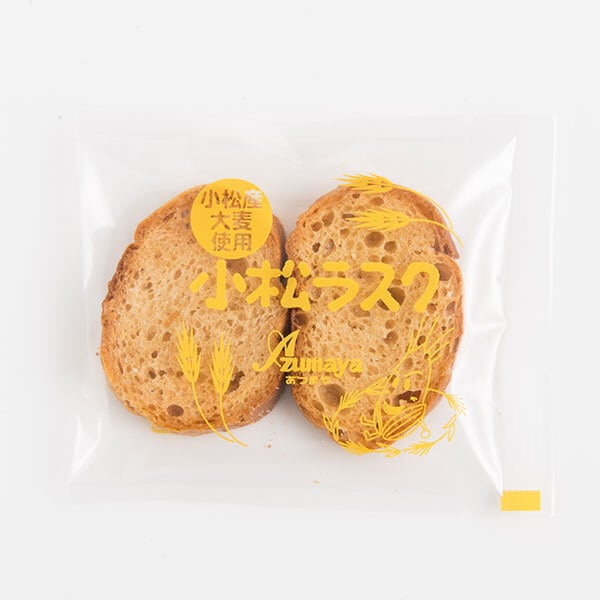 小松産六条大麦を使用した香ばしいフランスパンのサクサクラスク。プレーン・メープル・チョコの3種類をお詰めしております。