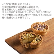 ⼩松の石文化が日本遺産に認定さ れ、石を素材にしたお菓子に仕上げました。 タルトの中に米粉入りアーモンド スポンジを入れ、ナッツ類を石に 表現しサクサクとしっとりとした 軽い食感のタルト菓子です。冷蔵庫で冷やしていただくと、より美味しくいただけます。